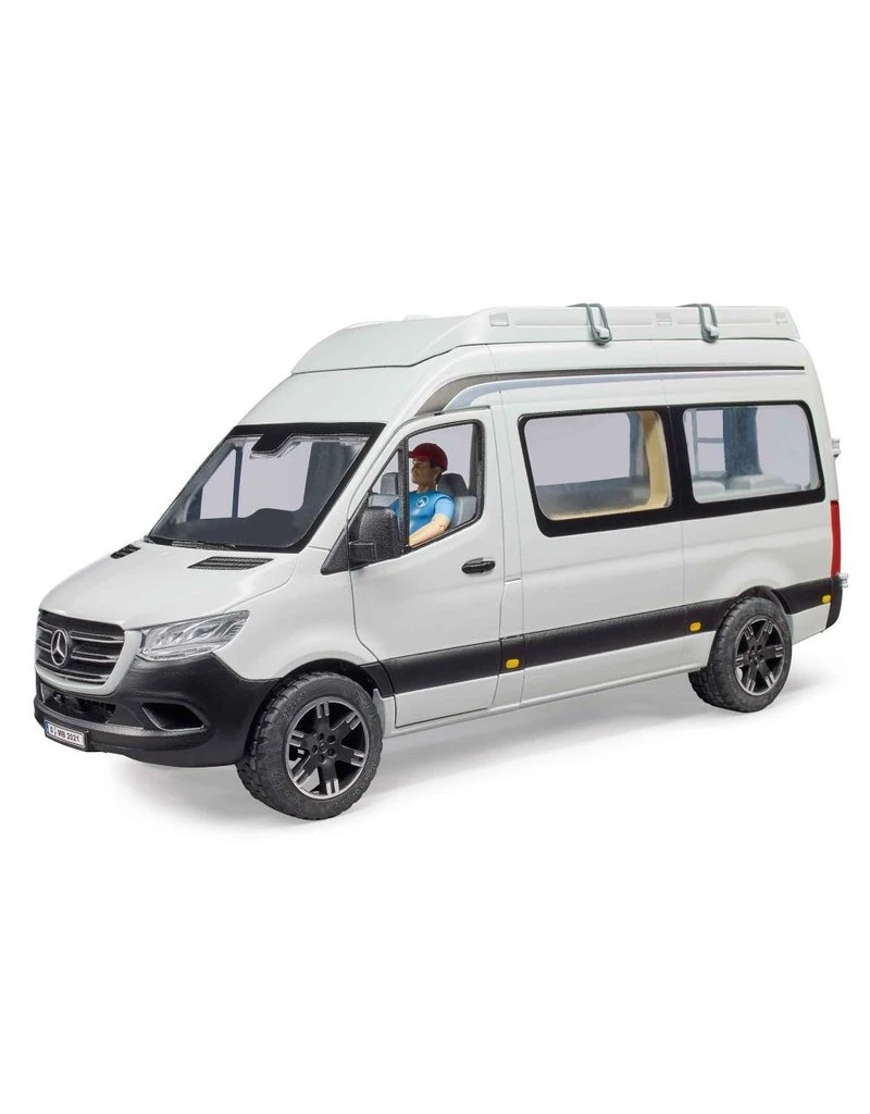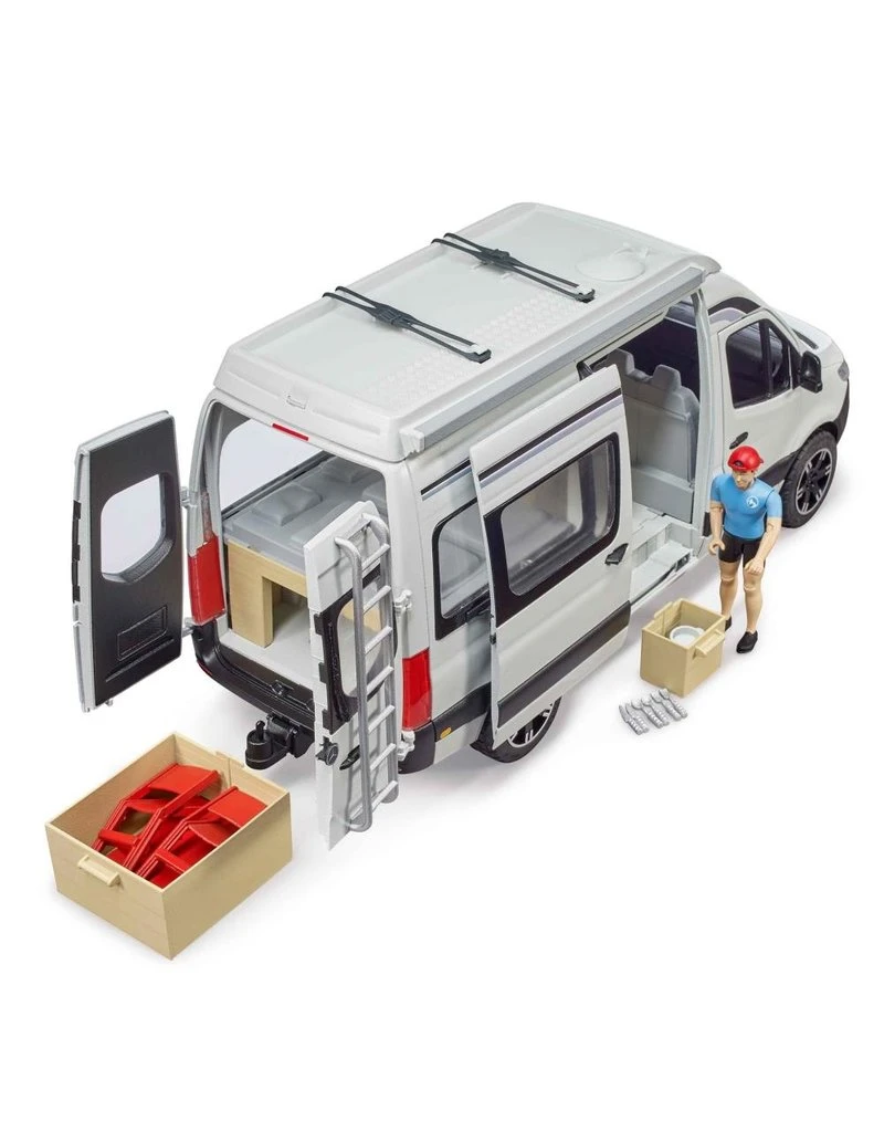 Grote speelgoed camper. Bruder maakt de camper met een Mercedes Sprinter als basis. De witte bus heeft een mooi interieur en campeer tafelset.