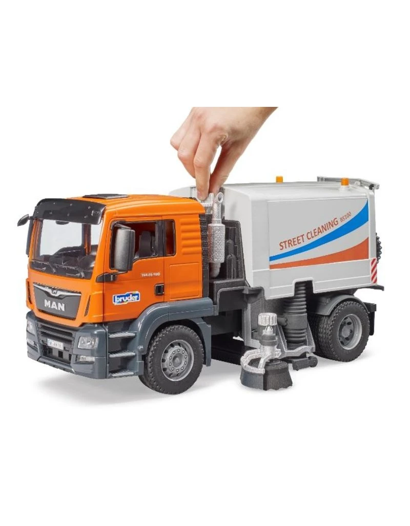 Bruder vrachtwagens zijn gemaakt om mee te spelen. De auto is gemaakt van slagvast kunststof. Veel onderdelen bewegen ook zoals de stuurinrichting, veegarm naast de auto en opzuiginstallatie onder de auto kun je in hoogte verstellen.