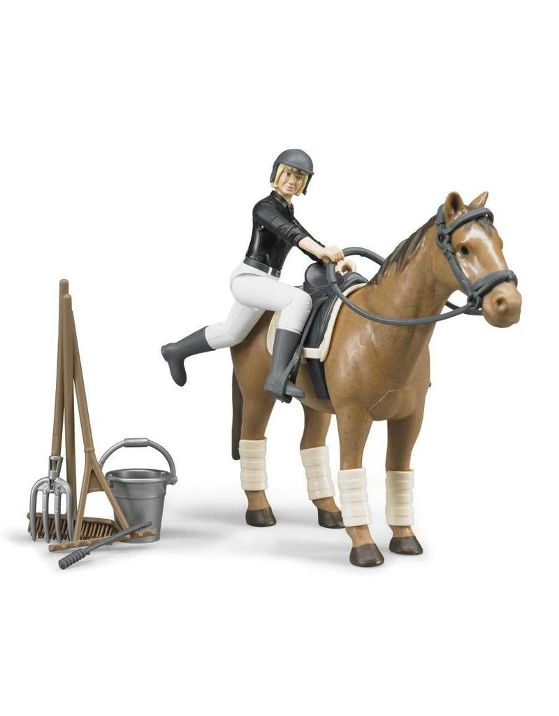 In de grotere 1;16 maat van bruder dit paard met ruiter en accessoires. Goed te combineren met ander Bruder paarden speelgoed.