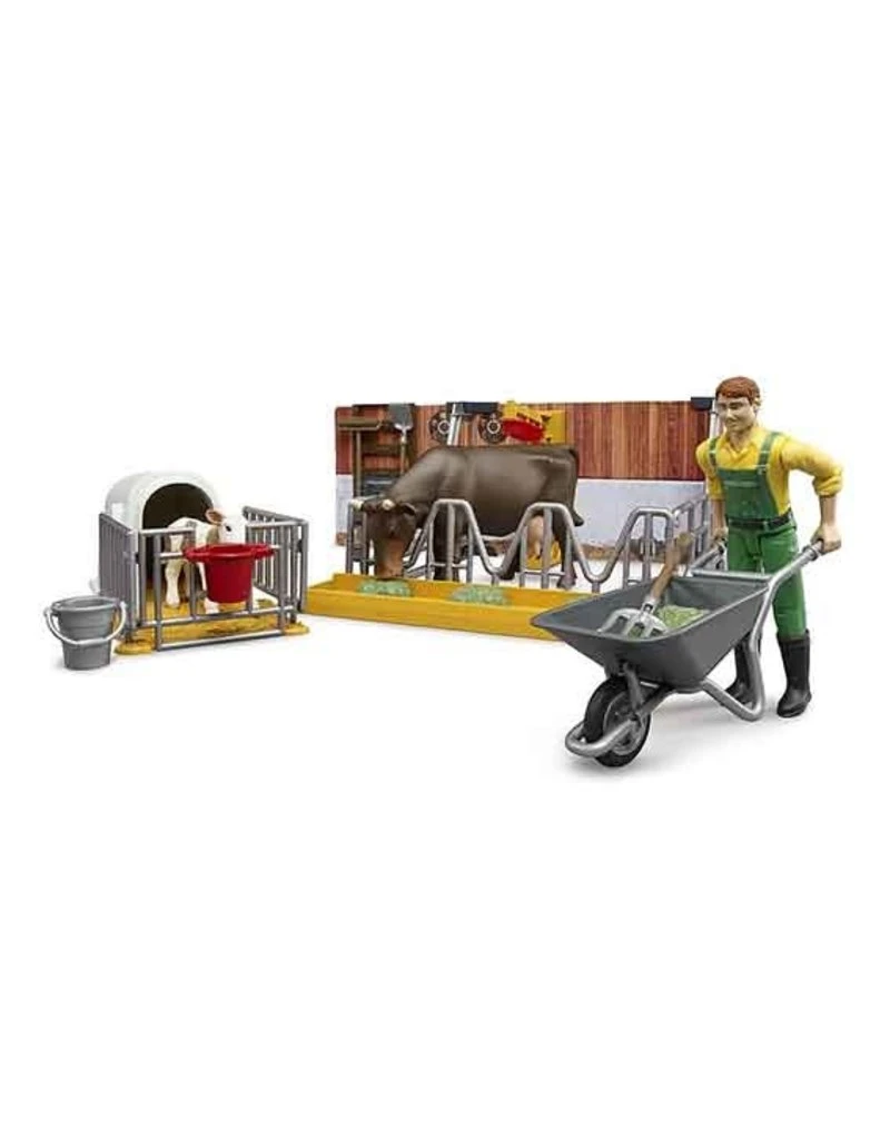 Bruder 62611 – Koe en kalverstal met boer