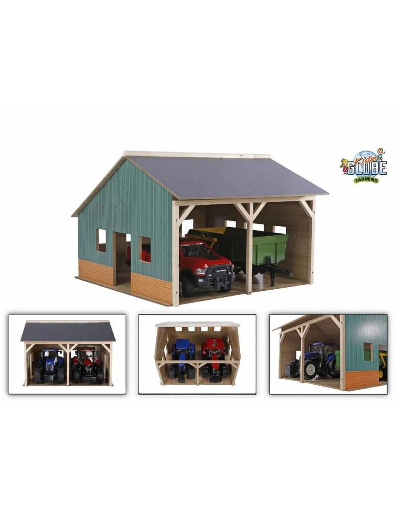 Houten loods met grijs dak en groene zijwanden voor 2 tractoren. Speciaal ontworpen voor gebruik met de tractoren/machines van Bruder ().
