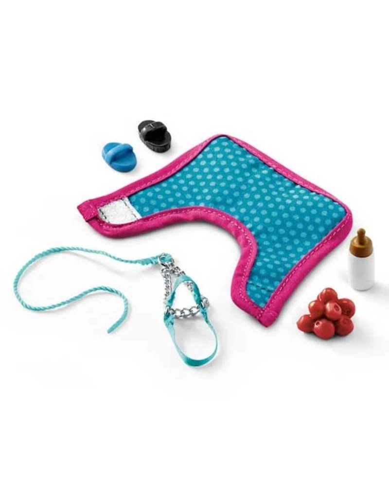Speciaal voor je jonge Schleich veulen, een verzorgingsset. Compleet met dekentje, borstels en het eten.