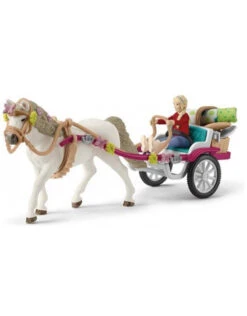 Mooie combinatie van Schleich paard met koets, accessoires en meisje met fruitmand. De koets kun je versieren met vlinders, hoefijzers en blaadjes.