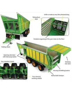 Toptractor in HO-formaat met stevige drie-as-trogvormige kipwagen. Getrouw naar het originaal vervaardigde velgen met gegommeerde loopvlakken. Afneembare kap, frontgewicht en aanhangwagen-koppeling. Vervolledigd wordt het model door een nieuwe, heel gedetailleerd gevormde voorlader met schep. De drie-as trogvormige kipwagen van het merk Krampe bestaat, tot op kleine delen, bijna uitsluitend uit METAAL. Dit vormt in het groottebereik 1:87 een nieuw kwaliteitscriterium. De gedetailleerde omzetting van vele kleine bijzonderheden aan deze combinatie maakt het model tot een pronkstuk op iedere kinderkamer-boerderij, in de verzamelaarvitrine of op de modelspoorweg.