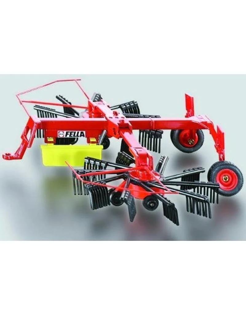 Na het maaien is het tijd om je gras bij elkaar te harken. Met deze dubbele zwadhark schiet het lekker op! De Fella heeft midden afleg en past goed achter de Siku 1:32 standaard tractoren.
