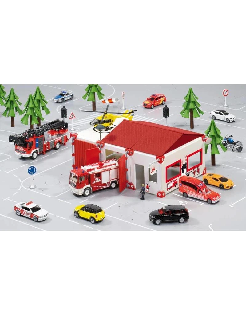 Goed voorbereid op het volgende alarm in de SIKUWorld is de nieuwe brandweer-speelset. Het blusvoertuig staat in de garage, klaar voor gebruik. De sirene op het dak klinkt. Alleen nog de deuren openen en men kan direct op weg naar de volgende klus. In de tweede garage en op de parkeerplaats naast de brandweerkazerne is bovendien nog genoeg ruimte voor nog meer commandowagens en reddingsvoertuigen. Voor een inzet in de lucht is op het dak van de garage een landingsplaats voor helikopters gemarkeerd. De windzak op het gebouw wijst de piloot de windrichting om optimaal te kunnen aanvliegen. De set kan in het flexibele systeem van de SIKUWorld worden geïntegreerd, maar ook apart worden gebruikt, omdat een van 4 bijgeleverde platen een schuine oprit heeft.