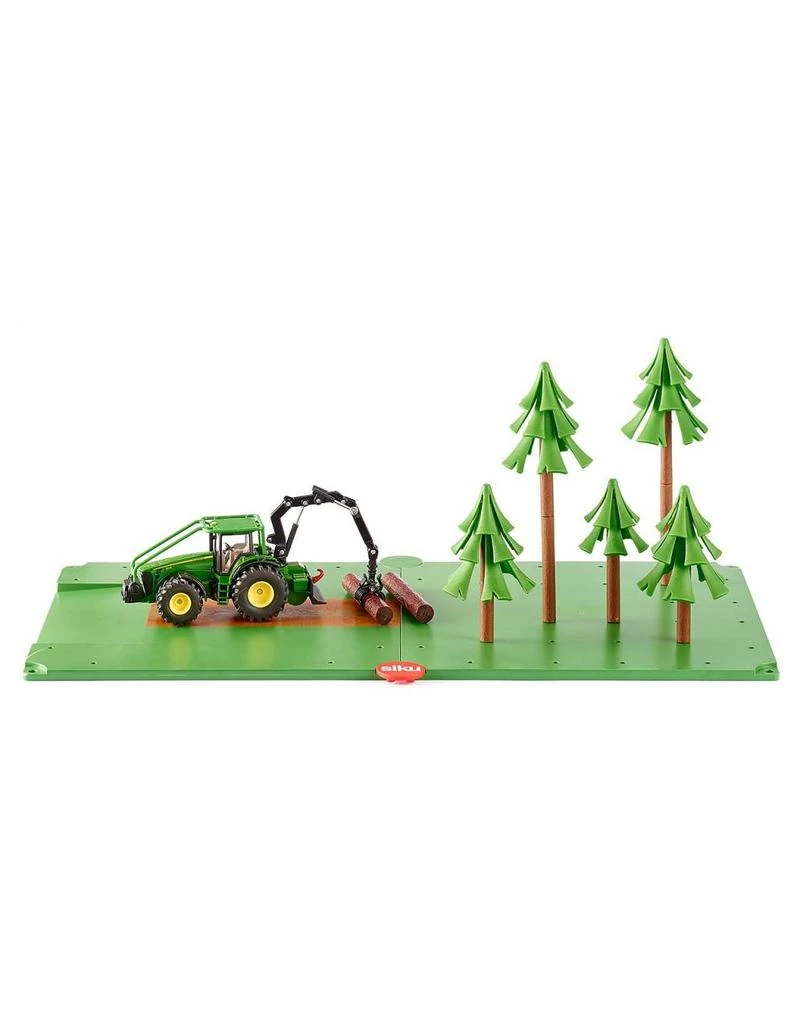 Speelwereld van Siku met bosbouw onderdelen. Wat opvalt is dat alle machines van het merk John Deere zijn.